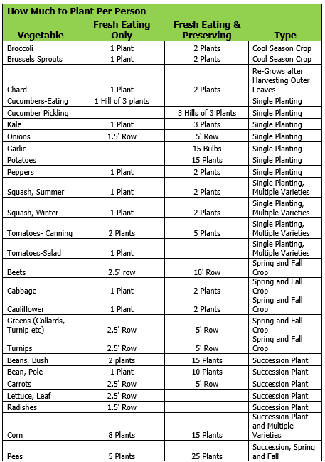 This chart is just a basic guide to help get the wheels turning. Take some time to sit down with your family and talk about what vegetables you want. Then you can determine how many plants you need, which will dictate the size of your plot.